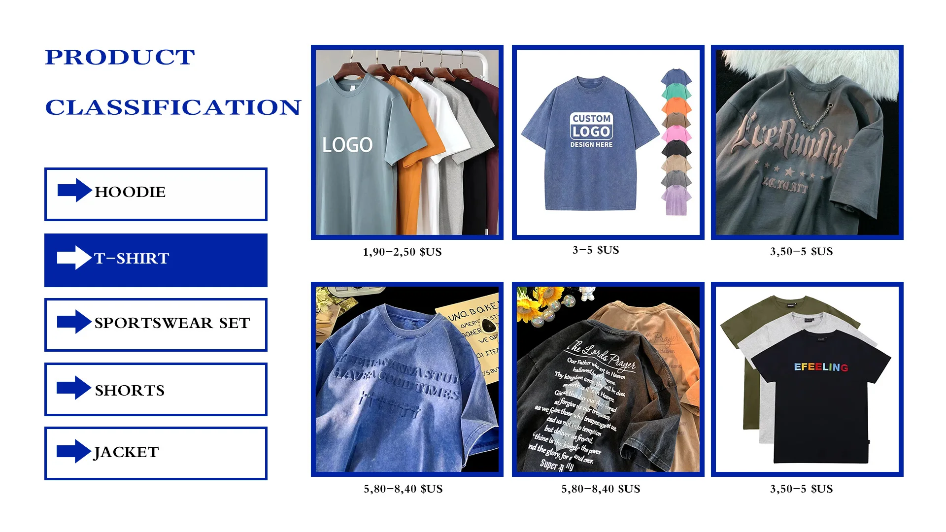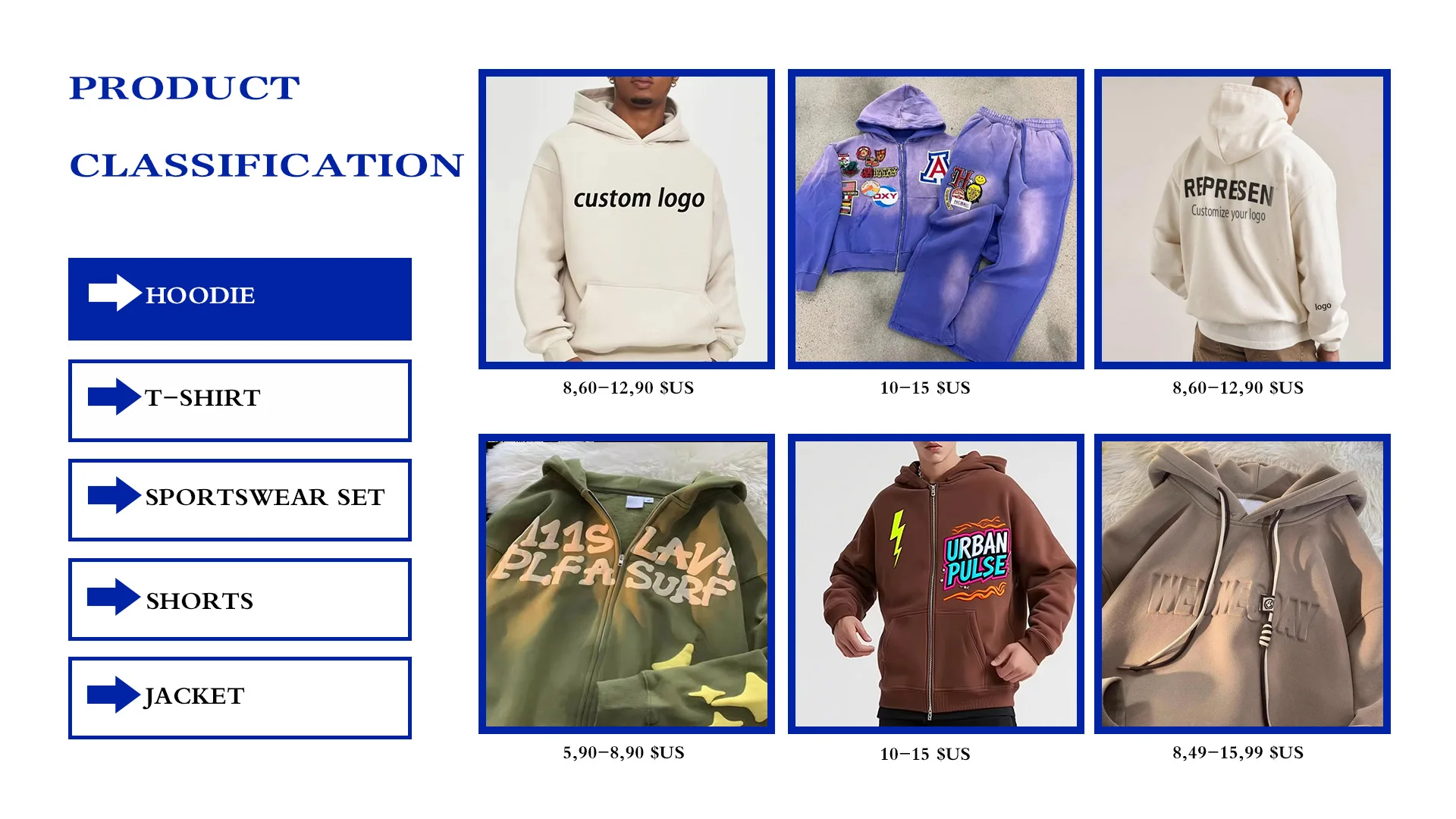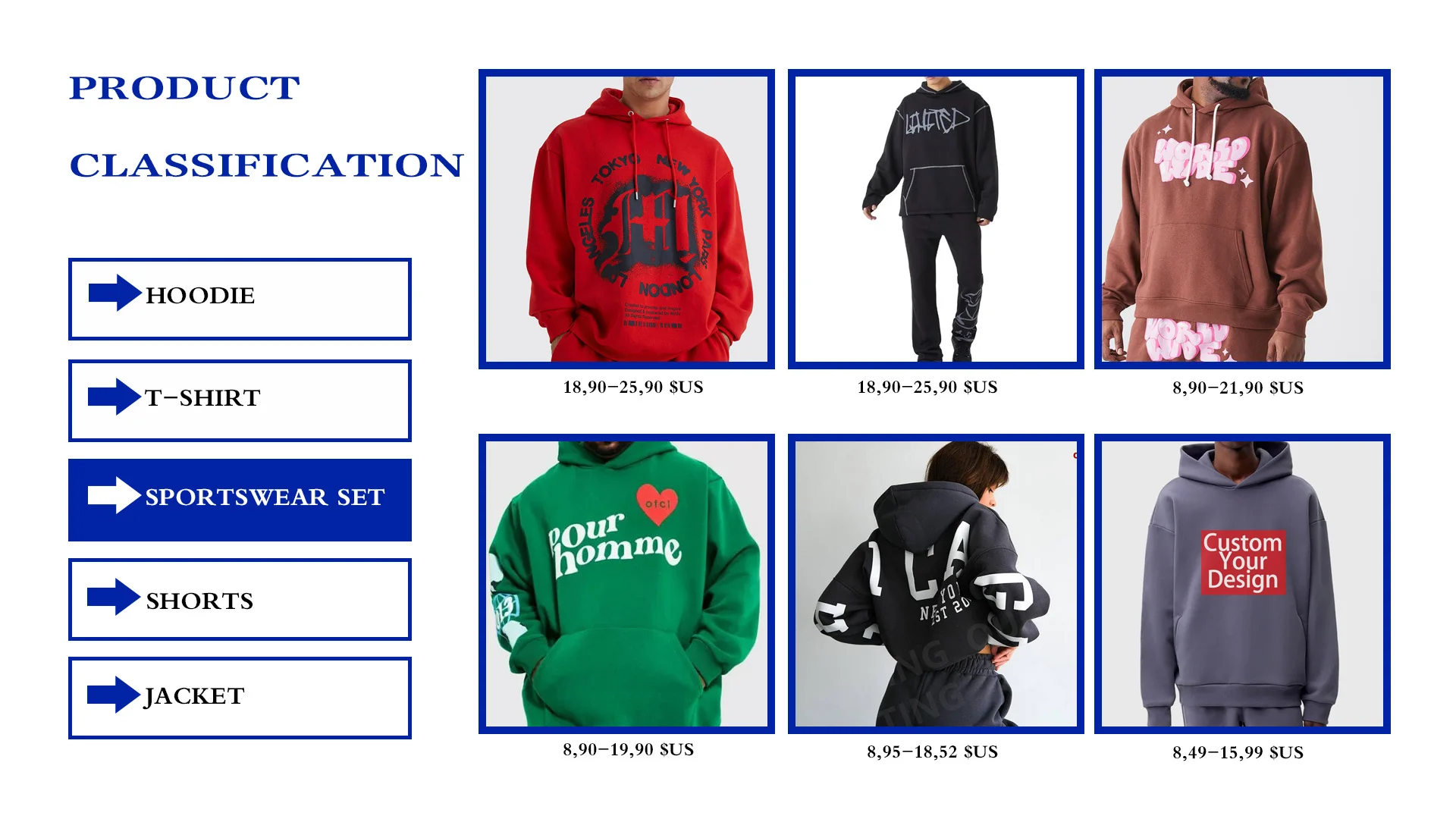 Produk utama: Kaus, Hoodie, celana pendek, pakaian olahraga, jaket